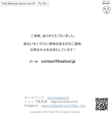 Participated in a presentation event at Fab Meetup Kyoto, a manufacturing community.